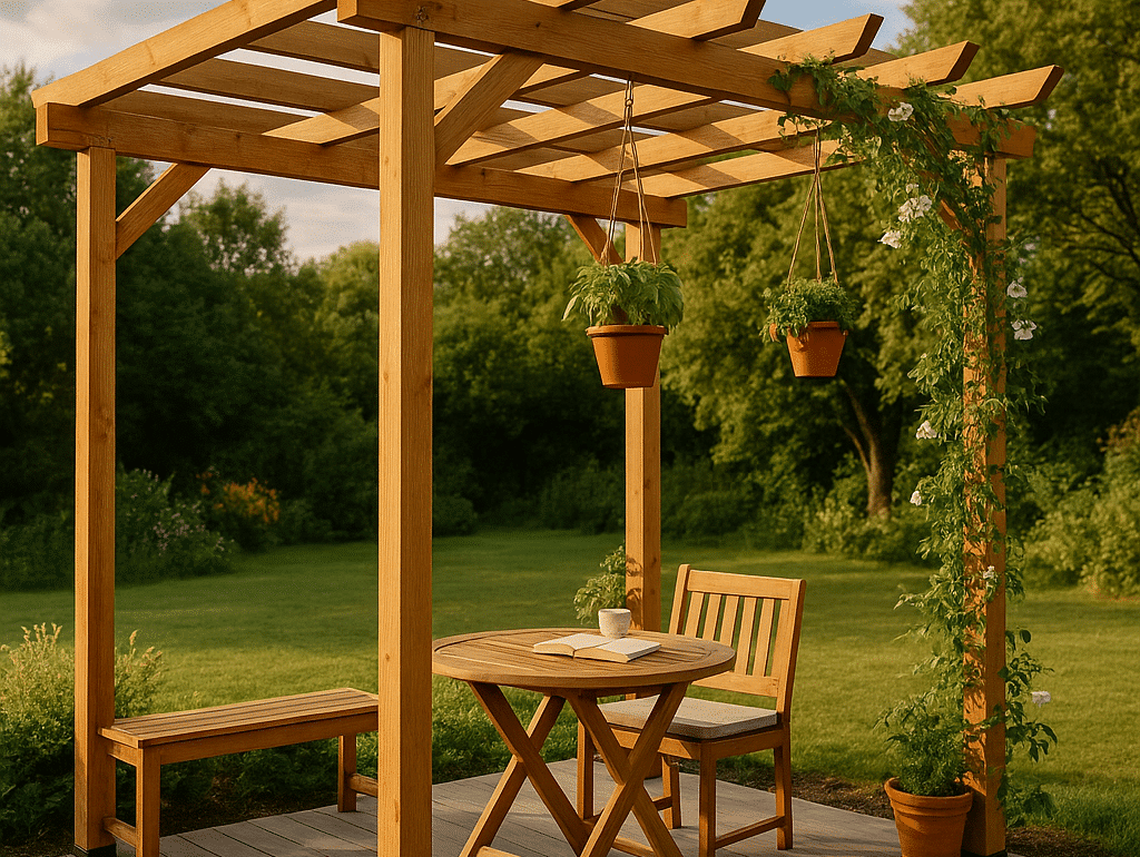Installée sur une terrasse en bois ou en dalles, elle devient un prolongement naturel de la maison. Avec quelques plantes grimpantes, jasmin, chèvrefeuille, rosier ou clématite , elle se transforme au fil du temps en arche végétale parfumée. Un simple claquement de feuilles au vent, un rayon filtré entre les branches, et l’on se croirait déjà ailleurs.