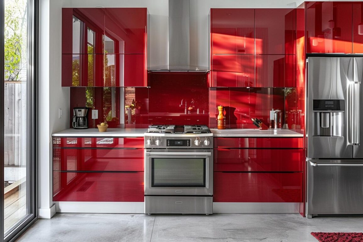 Si l’idée d’une cuisine entièrement rouge vous semble trop audacieuse, optez pour des touches discrètes telles que les portes des placards supérieurs ou un seul mur peint. Cette stratégie permet d’incorporer le rouge sans dominer l’espace, tout en ajoutant un effet ‘wow’ attrayant.